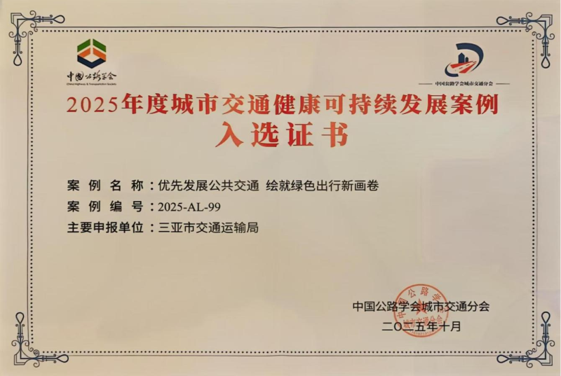 近日,在2025城市交通分会学术年会暨城市交通高质量发展研讨会上,三亚市交通运输局申报的“优先发展公共交通 绘就绿色出行新画卷”案例成功入选2025年度城市交通健康可持续发展案例。
