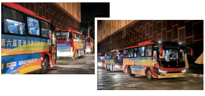 “运动员班车已到位,请核对乘车人数,确认无误后按计划发车!”调度人员对着对讲机清晰下达指令;“沙滩手球运动员全部登车,身份核对无误,准备发车!”调度员及时回复,指令往来间,现场一派紧张有序的忙碌景象。