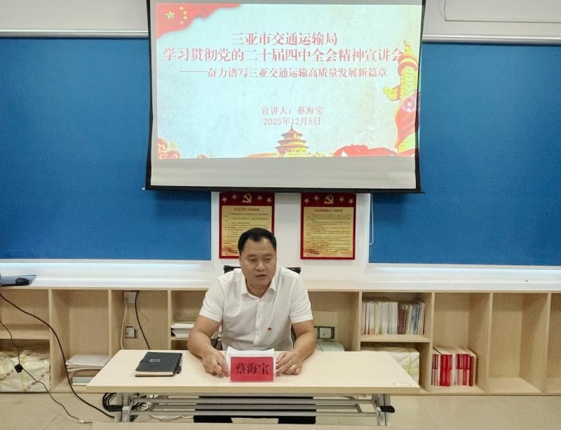 12月5日下午,三亚市交通运输局召开学习贯彻党的二十届四中全会精神宣讲会,局党组书记、局长蔡海宝以《奋力谱写三亚交通运输高质量发展新篇章》为题作宣讲。
