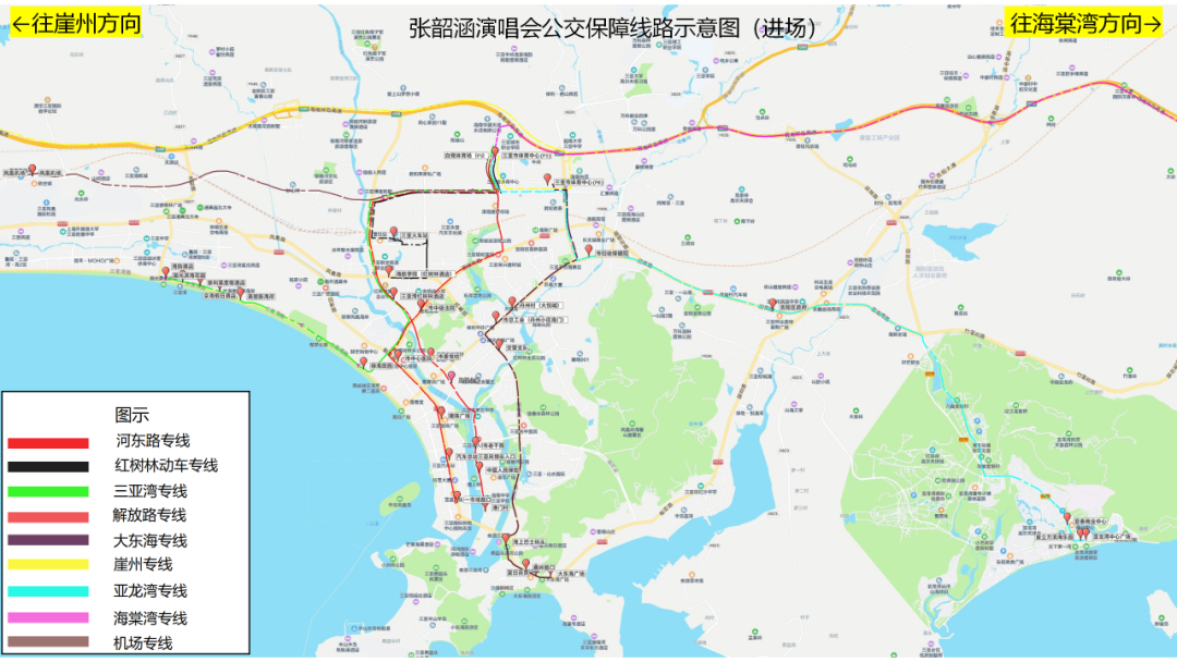 前往三亚站乘坐C9894次高铁的歌迷朋友可在鹿城大道警务岗亭旁乘车,直达三亚站的车辆最后发车时间为22:20。
