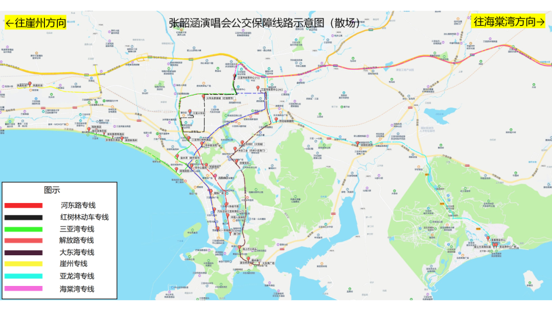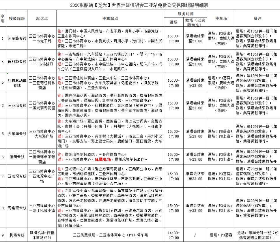出行前,请提前规划好返程路线,了解掌握返程免费公交线路上车点、停靠点位置;散场时,建议优先选择搭乘免费公交车,离开体育中心观众集中出行区域后,再选择其他交通工具至目的地。祝广大歌迷朋友们在三亚度过一个温暖开心、欢乐难忘的演唱会之夜。