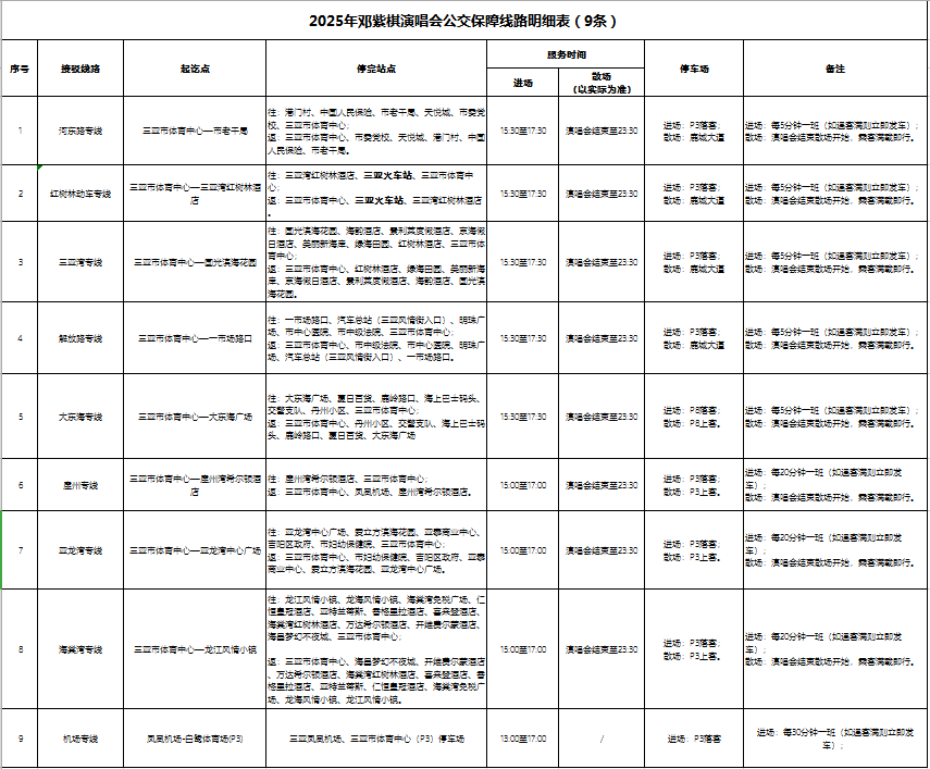出行前,请提前规划好返程路线,了解掌握返程免费公交线路上车点、停靠点位置;散场时,建议优先选择搭乘免费公交车,离开体育中心观众集中出行区域后,再选择其他交通工具至目的地。祝广大歌迷朋友们在三亚度过一个温暖开心、欢乐难忘的演唱会之夜。