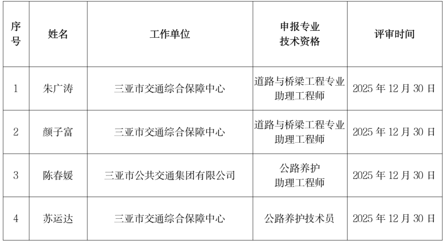 根据《关于做好2025年度三亚市职称评审工作的通知》(三人才局﹝2025﹞3号)文件要求,2025年度我市申报交通运输领域工程初级专业技术资格评审共4人,通过评审委员会投票表决的共计4人(初级)。